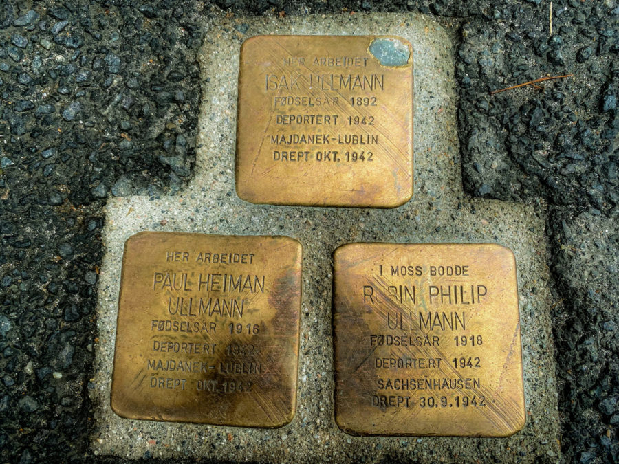 Vi starter turen foran høyvekta på Moss og går over til forretningen til Isak og Ida Ullmann. I boka ”Jakten etter jødene på Agder” fortelles det at 17. mai 1940 – på selveste grunnlovsdagen – fikk mange mossinger seg en støkk i livet da de oppdaget at Harry Benkows tannlegekontor var utstyrt med store gule plakater, en davidstjerne og ordene ”Jüdischer Zahnarzt”.